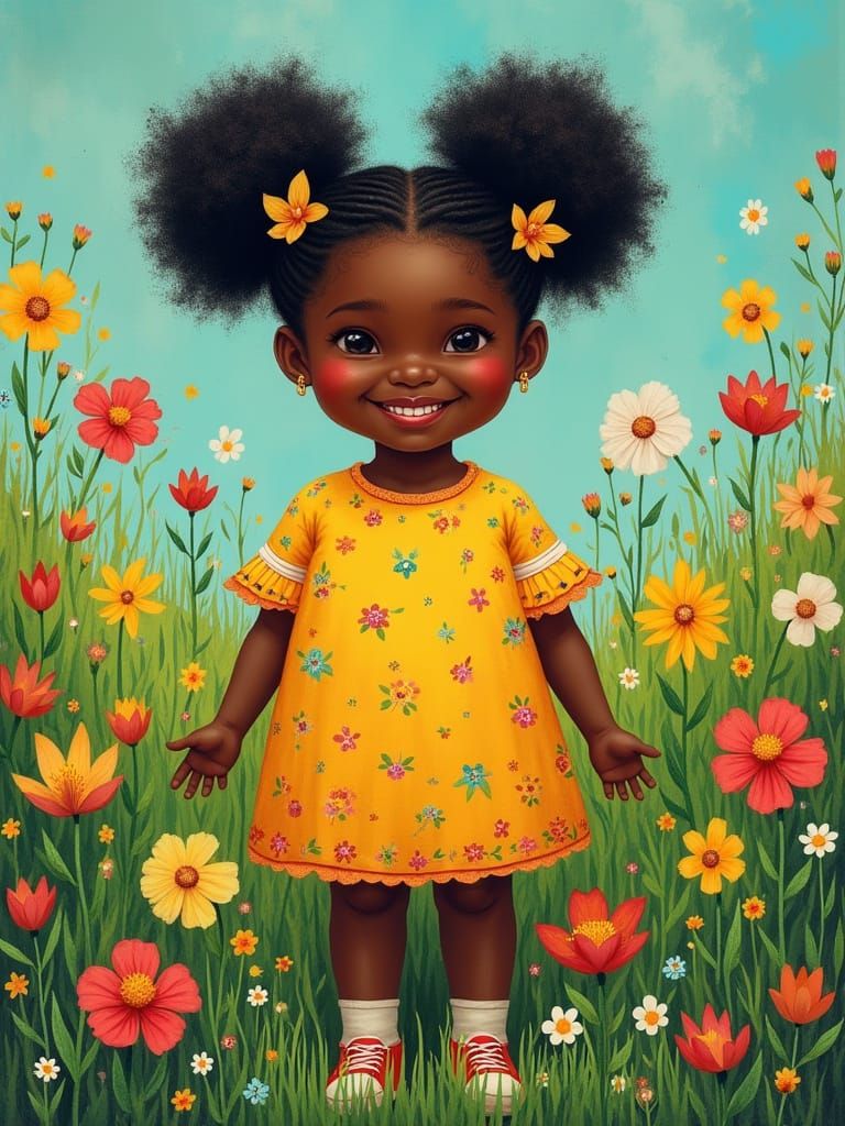 A vibrant image of a smiling young black girl in a flower-filled meadow. The artwork evokes a modern art style with bold colors and patterns.
