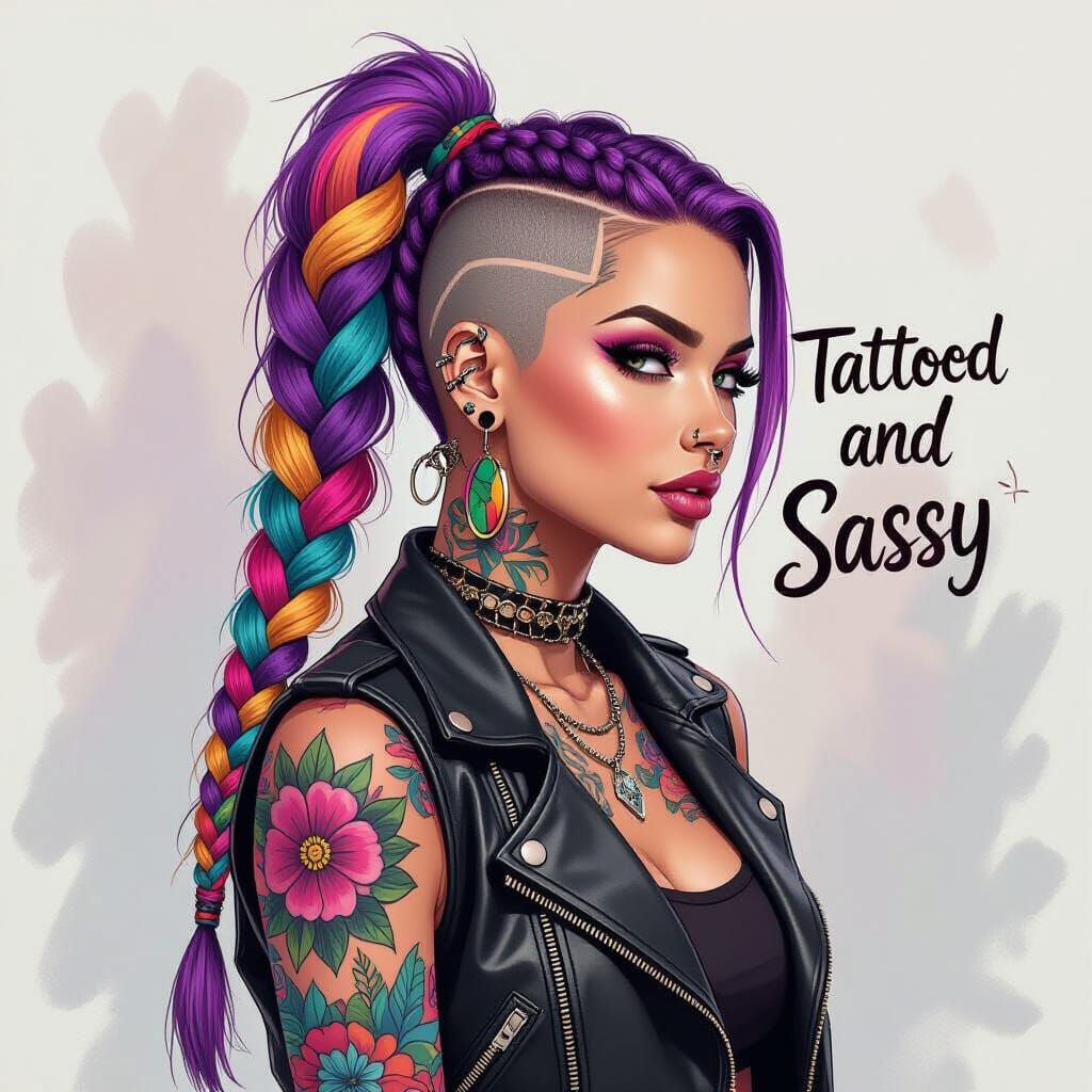 A digital painting of a vibrant woman with a braided rainbow ponytail, undercut, and tattoos. She wears a leather vest and accessories in a hyperdetailed style reminiscent of charcoal drawings.