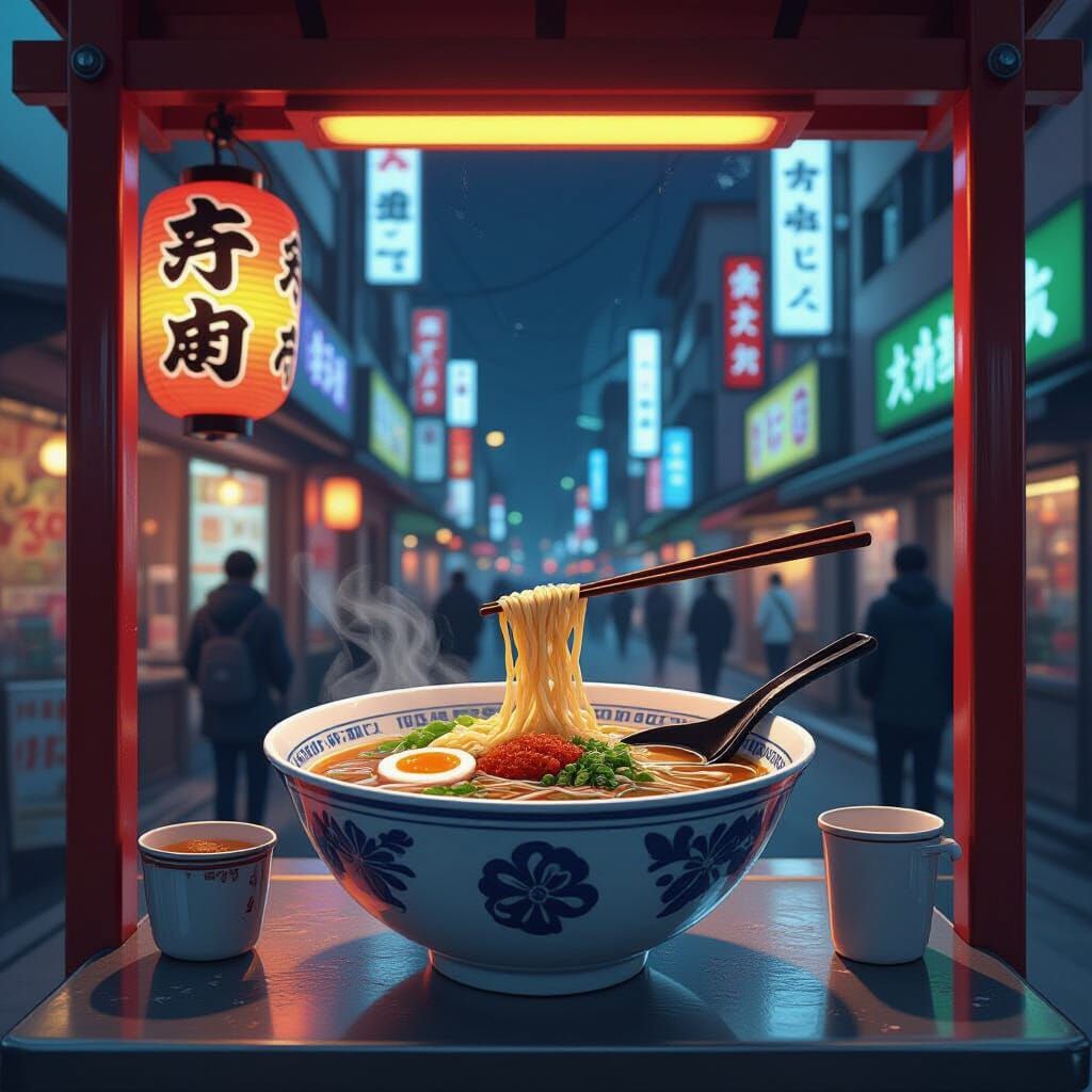 This image shows a steaming bowl of ramen in a vibrant noodle stand, set against a backdrop of bustling streets in a cyberpunk aesthetic.