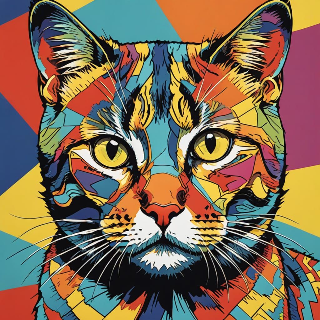This image features a stylish, silkscreened cat portrait in a bold, bright Pop Art style. It showcases repeating geometric patterns, reminiscent of Warhol's iconic aesthetic.