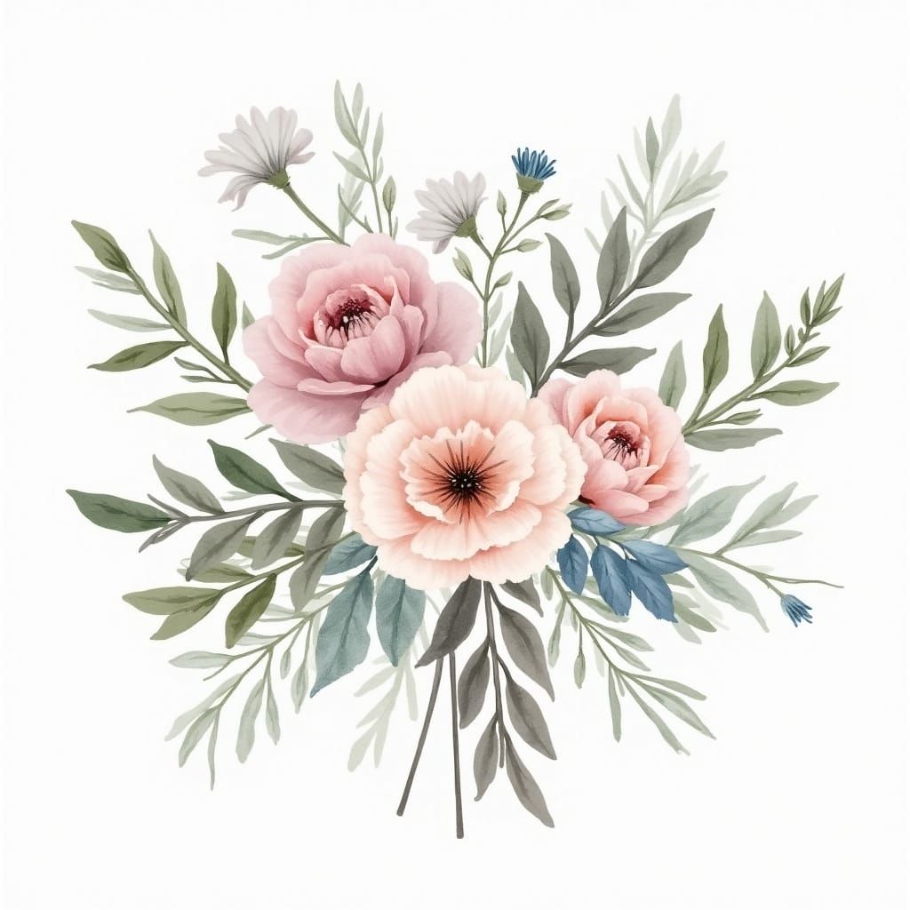 This watercolor illustration features a delicate, whimsical bouquet in soft focus, with pale pink, mauve, and dusty blue flowers surrounded by muted green foliage, evoking a sense of romanticism and elegance.
