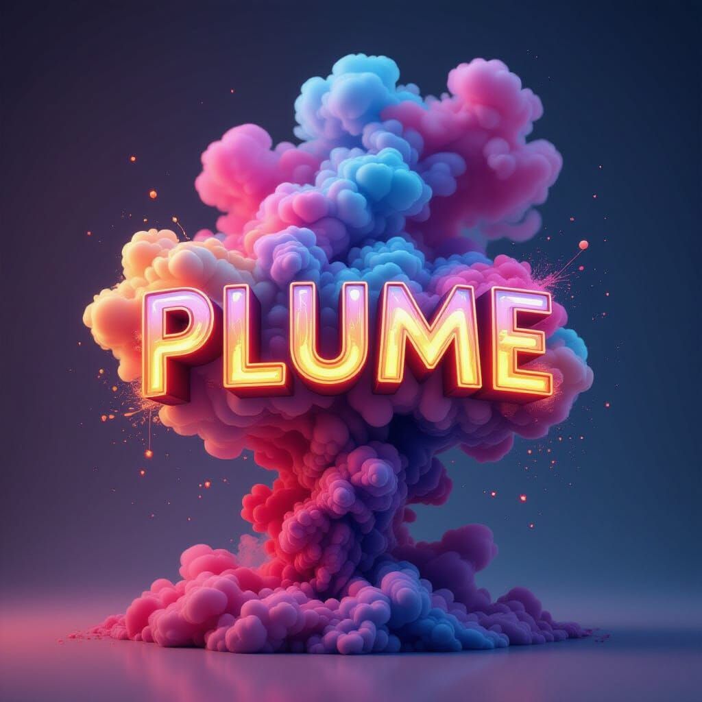 This image showcases a vivid, colorful gas cloud with the word "PLUME" displayed in a glowing font. Rendered with intricate detail and deep colors, it evokes a fantasy concept art style.