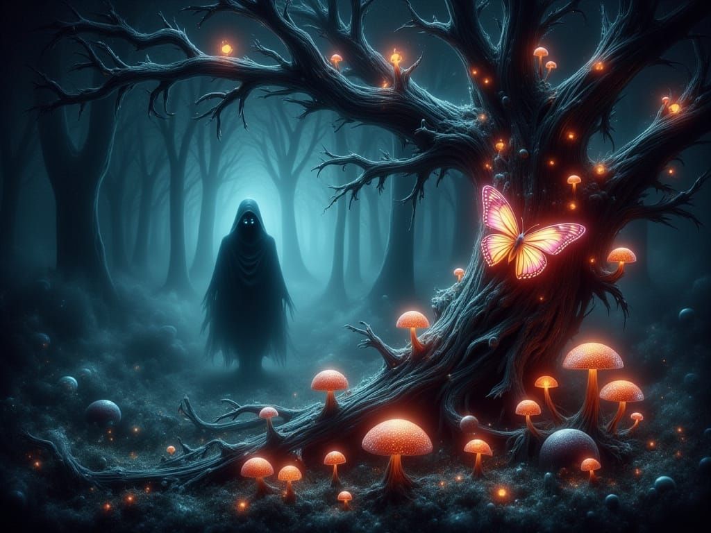 This dark fairytale illustration features a glowing butterfly on a mushroom-covered tree. A mysterious hooded figure emerges from shadows, creating an atmosphere of enchantment and dread.
