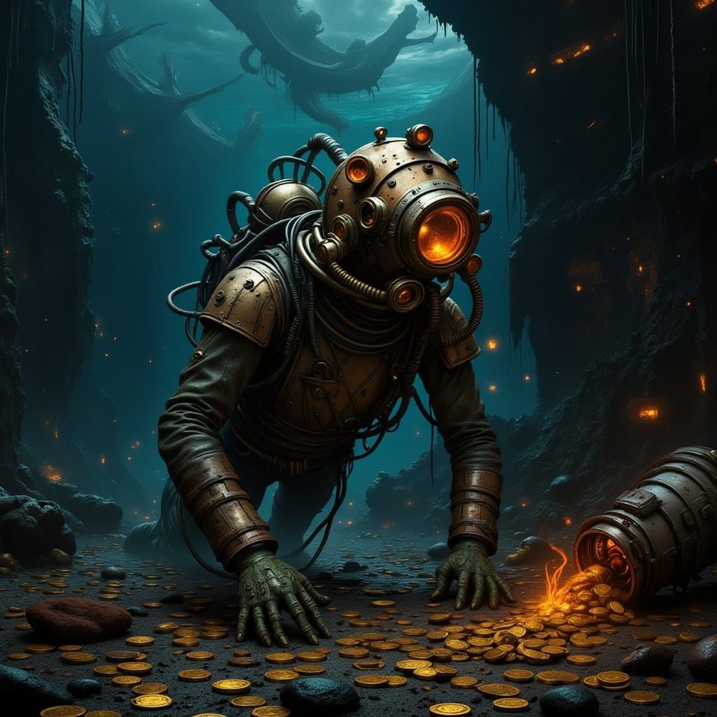This image shows a deep-sea diver exploring an ancient shipwreck. The diver's suit is detailed with copper and leather elements, with glowing lava, gold coins and strange artifacts scattered around the scene in a cinematic, Lovecraftian style.