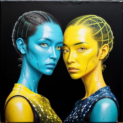 A striking picture of a surreal silhouette portrait. The artwork features two women and an alien set against a backdrop of lemon, blue and yellow acid rain, in a collage art style.