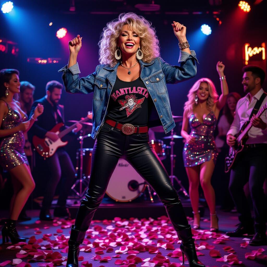 This image shows a middle-aged blonde woman dancing in a bar, wearing a black tank top, blue denim jacket and black leather pants. The scene is illuminated with modern lighting in a photorealistic style.