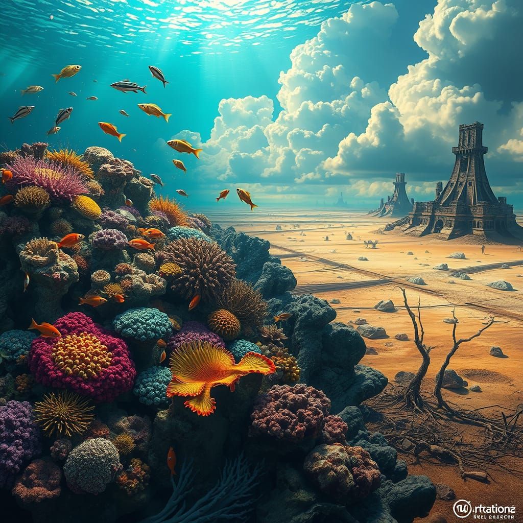 A vibrant coral reef flourishes amidst a desolate wasteland, symbolizing life against decay. This detailed image showcases a strong contrast with deep colors and intricate, fantastical elements as digital art.