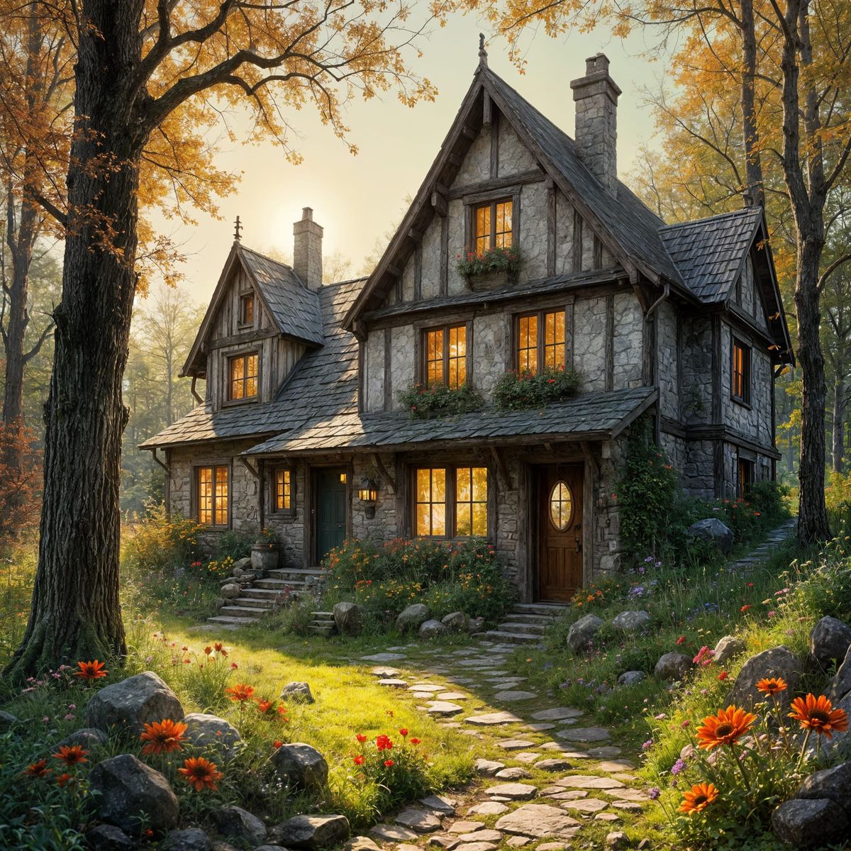 This image shows a charming cottage nestled in a serene woodland setting. The artwork features warm colors, earthy textures, and soft lighting, creating a cozy and idyllic atmosphere.