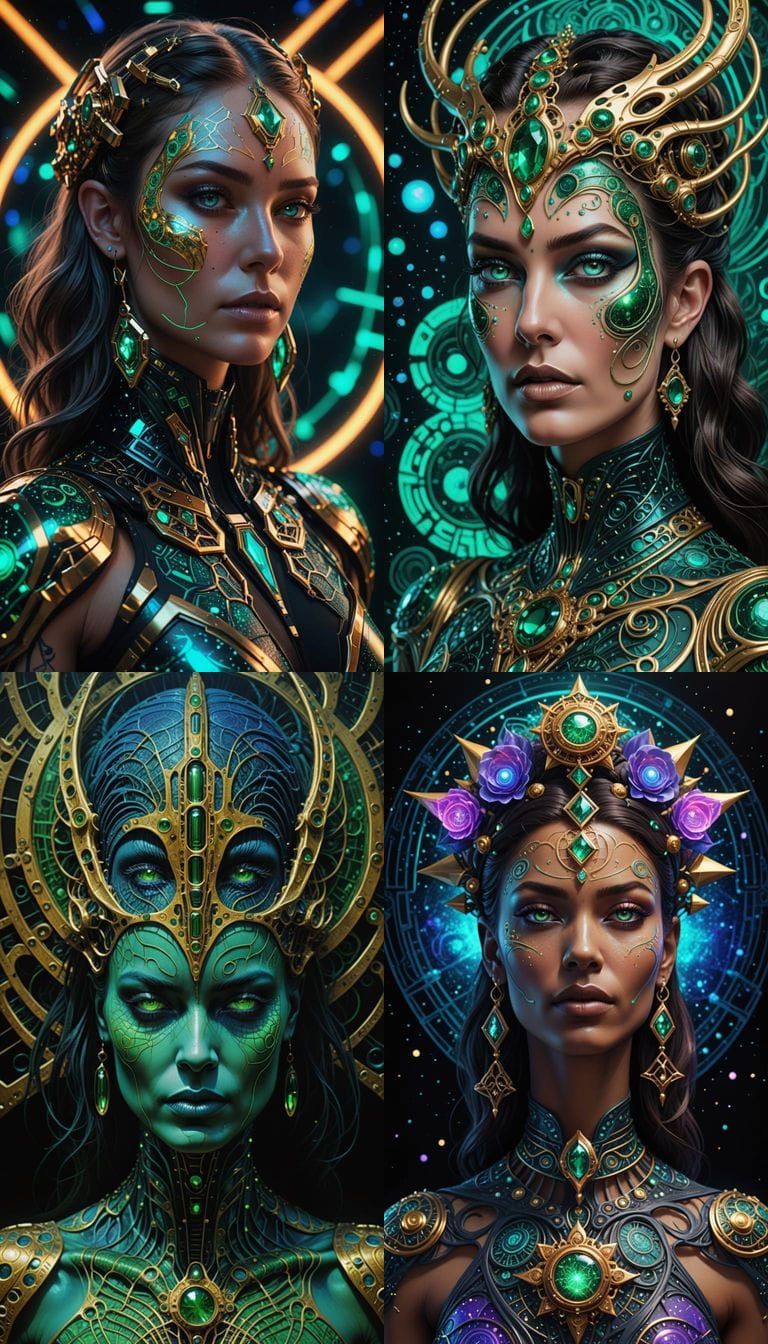 This image showcases a stunning, lifelike portrait of a woman adorned in vibrant, intricately detailed clothing and futuristic jewelry, featuring UV tattoos depicting a celestial galaxy and an om symbol for spiritual depth.