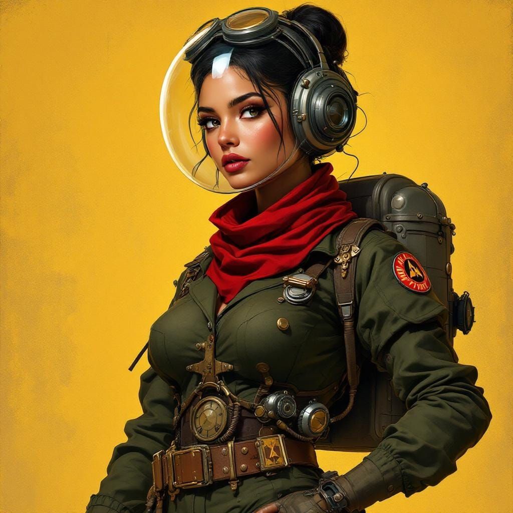 This image shows a muscular Hispanic woman in a steampunk military outfit with a clear space helmet. The retro-futuristic illustration features a golden-yellow textured background, reminiscent of vintage futurism art.