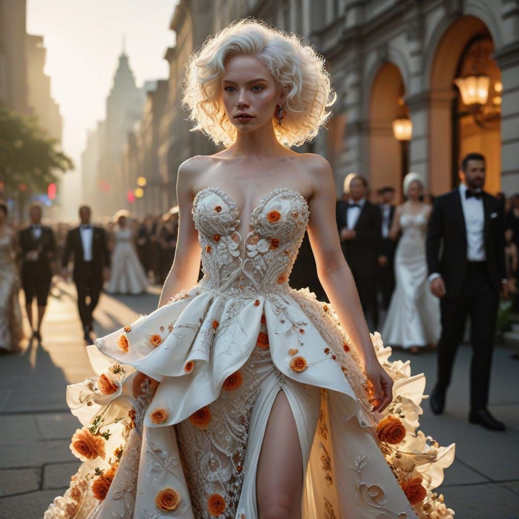 A digital image showing a woman in an elaborate gown standing before a mountain sunrise. The artwork features resin wire art flower bloom details and has a hyperdetailed, 8K resolution.