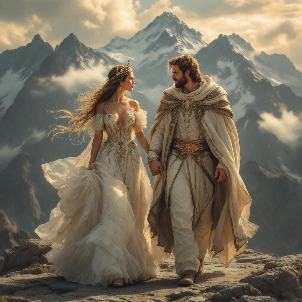 This image shows a queen and king walking hand-in-hand across a mountain landscape. The artwork is reminiscent of Alphonse Mucha, with touches of James Jean and dramatic lighting.