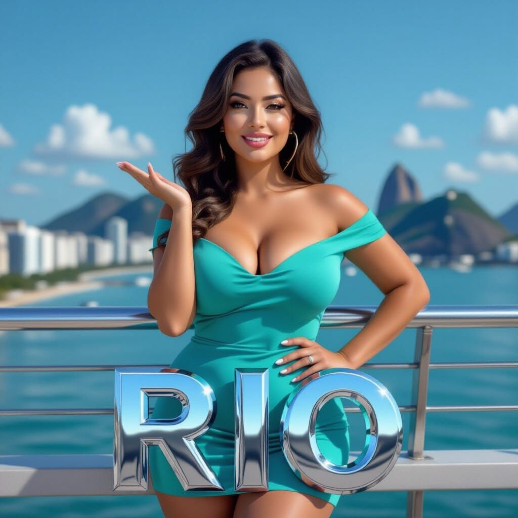 This image shows a beautiful Latina woman with brunette hair and dreamy eyes, wearing a short dress. The words "RIO" are displayed at the bottom in a chrome effect.