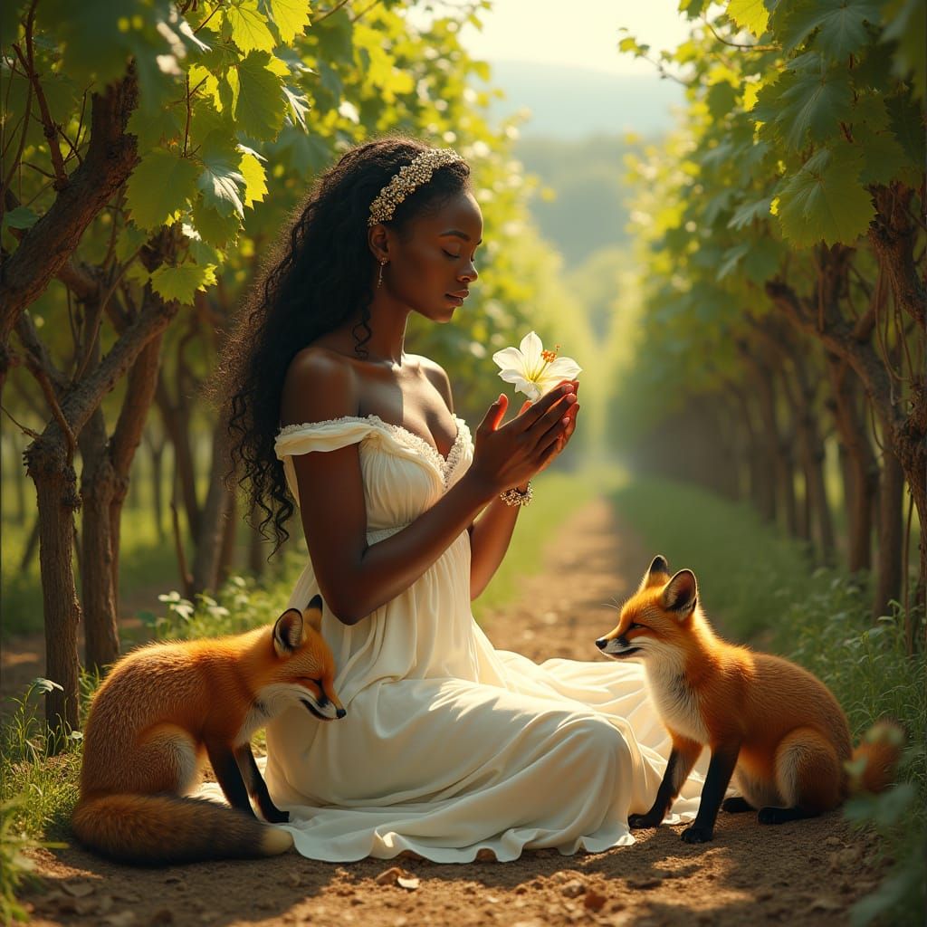 This image shows an ebony queen in a white gown, praying with a lily. The serene scene includes foxes in a vineyard, bathed in warm light reminiscent of surrealist and Art Nouveau art.