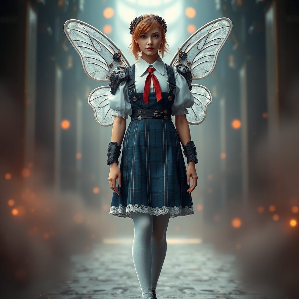 A striking image of a fairy woman in a futuristic school uniform, adorned with intricate mechanical details and metallic accents, set against a dramatic cinematic background, evoking a sense of wonder and magic, with a sleek, high-definition aesthetic reminiscent of sci-fi art.