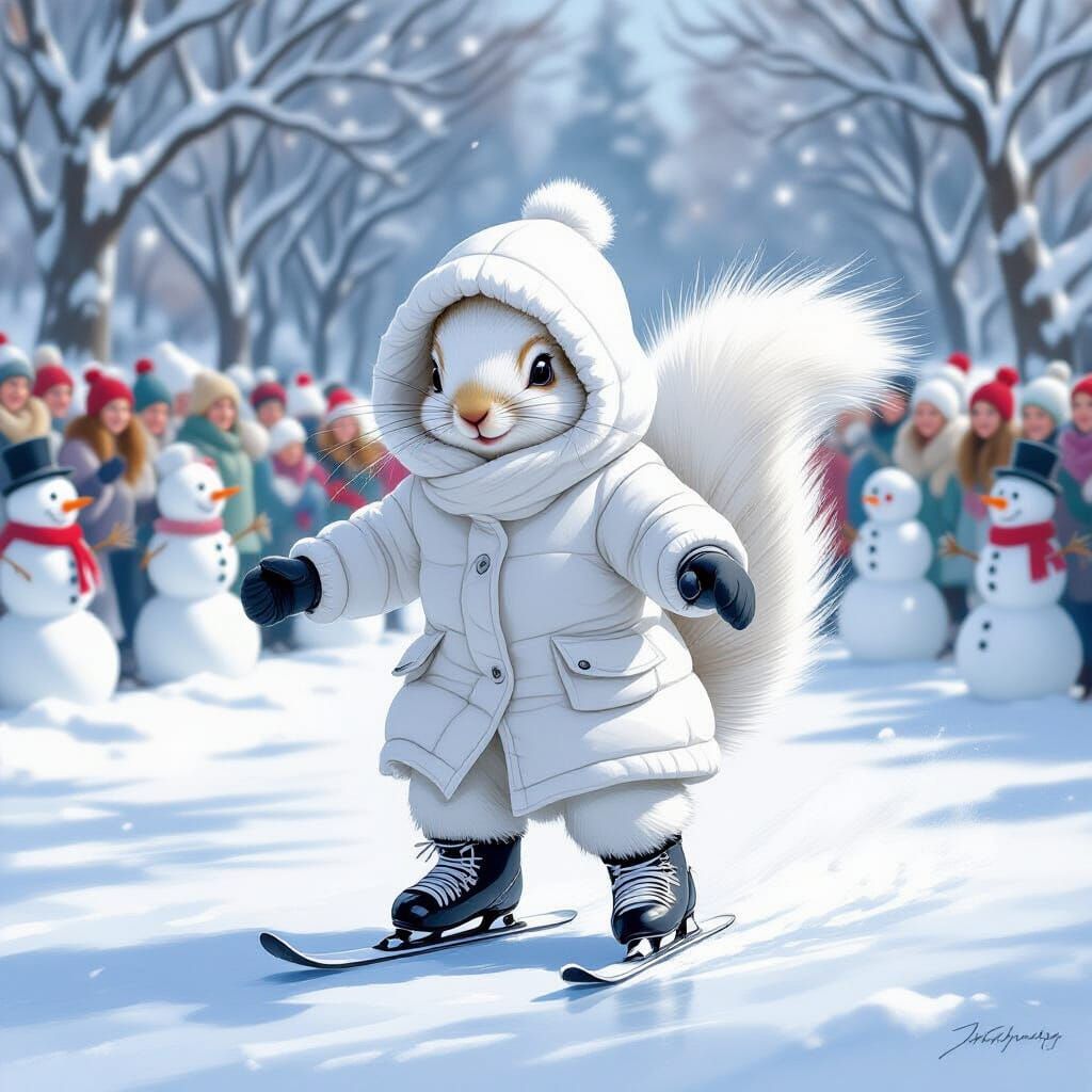 A whimsical image of an albino squirrel ice skating on a frozen lake, wearing a white parka. Cheerful snowmen surround the squirrel. The scene is rendered in a painterly style.
