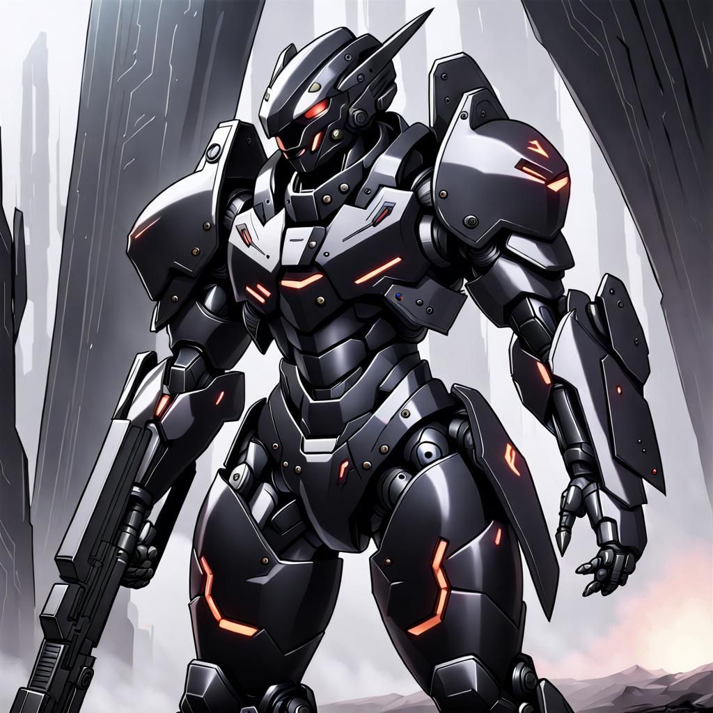 A striking picture of black, heavy-duty combat armor with integrated weapons and rounded edges. This image showcases a futuristic, ethereal design.