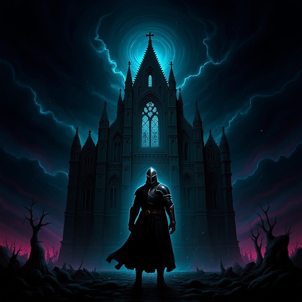 This striking image reimagines Blade Runner as a gothic fantasy epic, featuring a knight before a decaying cathedral under a stormy, neon sky. It's rendered in a dramatic splash art style.