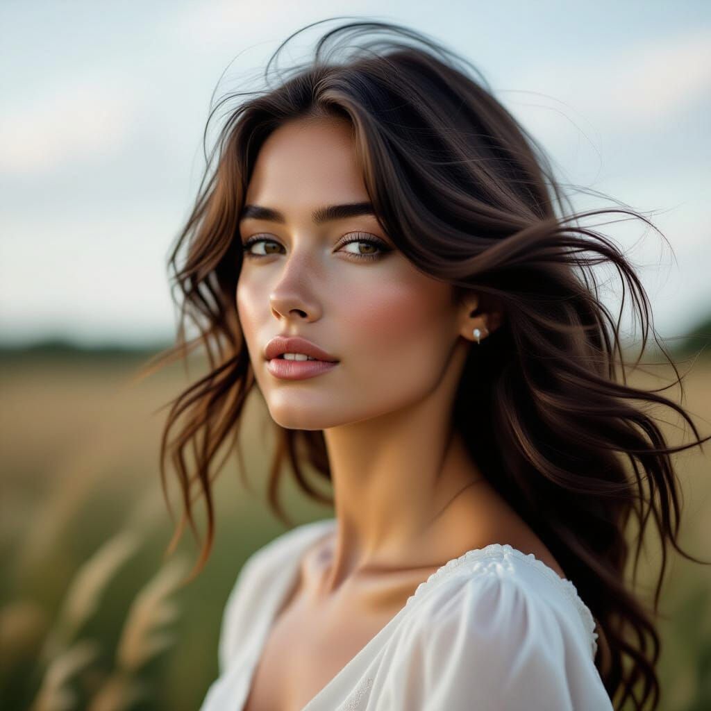 This photograph captures a subtle moment with hair blowing in the wind and a slight turn in pose. Shot with shallow depth of field and soft lighting, it evokes a contemplative mood.