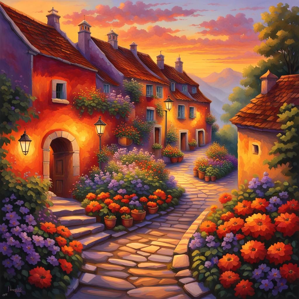 A vibrant village scene at dawn or dusk, showcasing colorful buildings and lush flowers. A stone path leads to a serene conical volcano under a pastel sky, in an idyllic landscape.