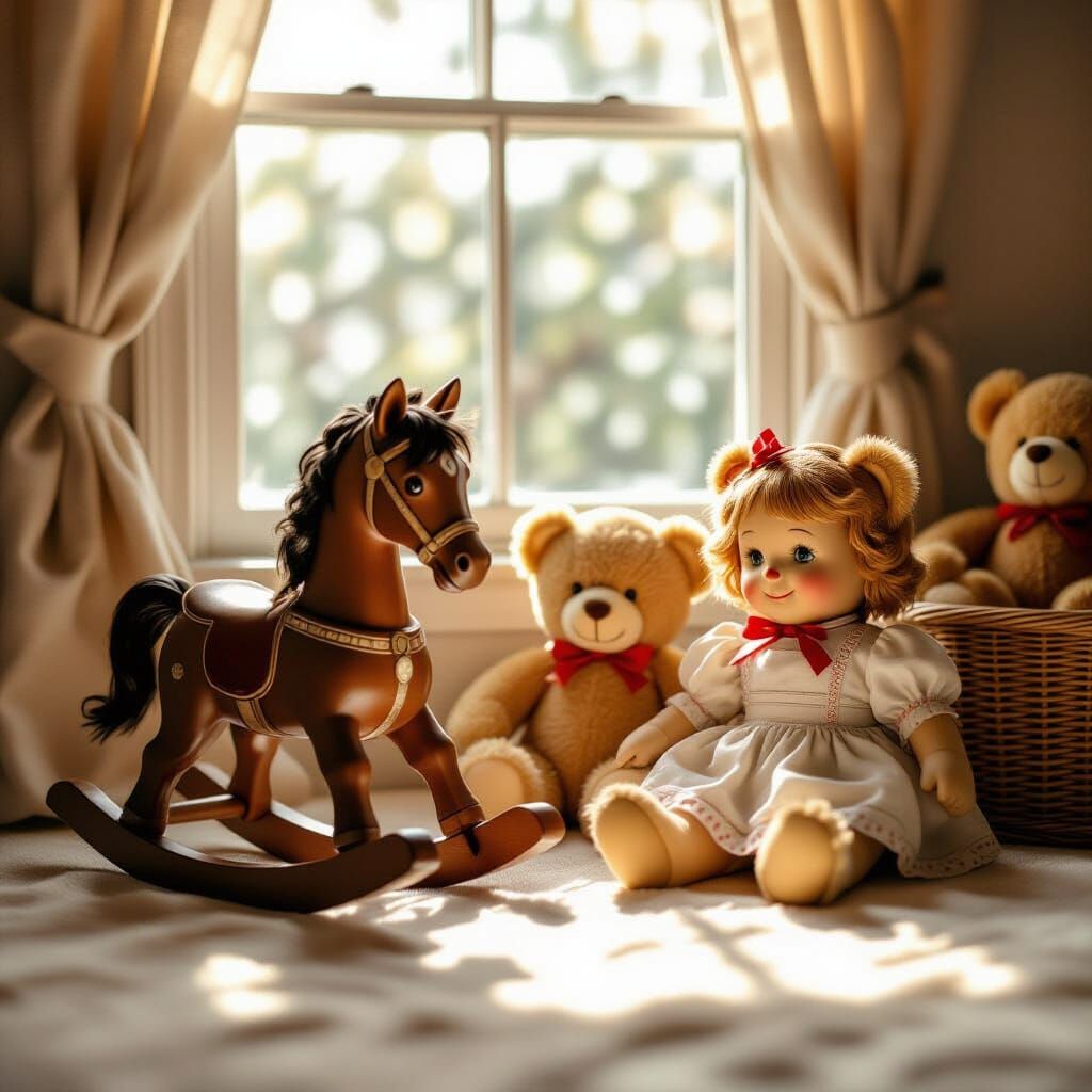 This image shows a photorealistic vintage nursery scene featuring antique toys like a rocking horse and Raggedy Ann doll. Warm light illuminates the room, creating a nostalgic and comforting atmosphere.