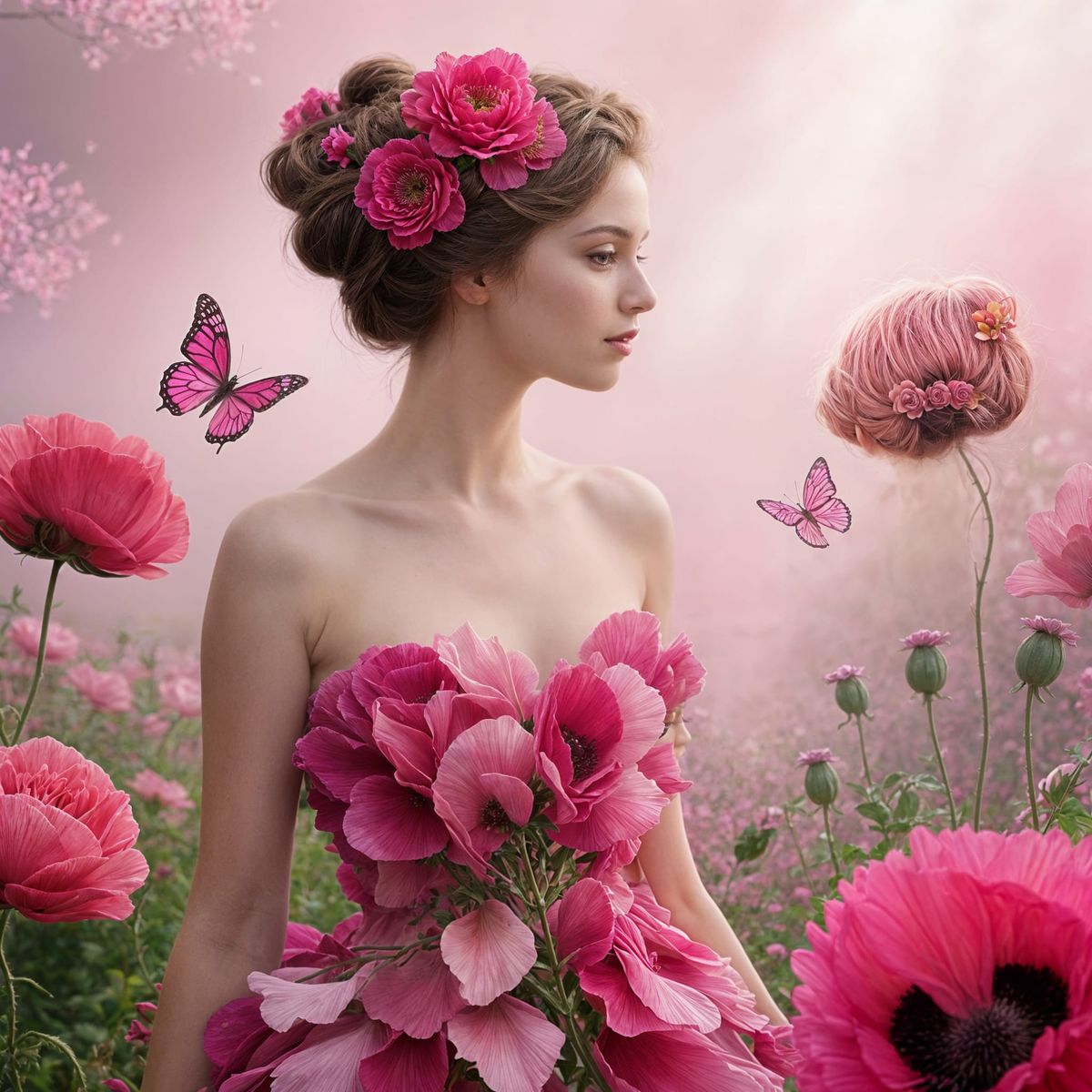 This image shows a woman embodying a living flower, adorned with magenta petals and blooms. Ethereal lighting and a vibrant floral palette create a surreal, fairy-tale aesthetic.
