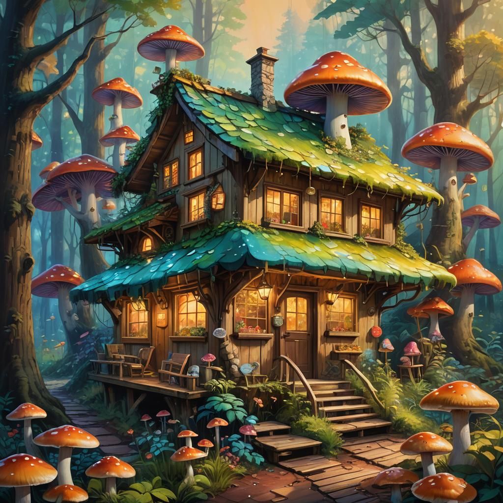 A vibrant oil painting of an enchanted shop nestled in a luminescent forest. Lush foliage adorns the wooden facade, with iridescent mushrooms glowing softly. Captured in soft morning light with intricate detail.