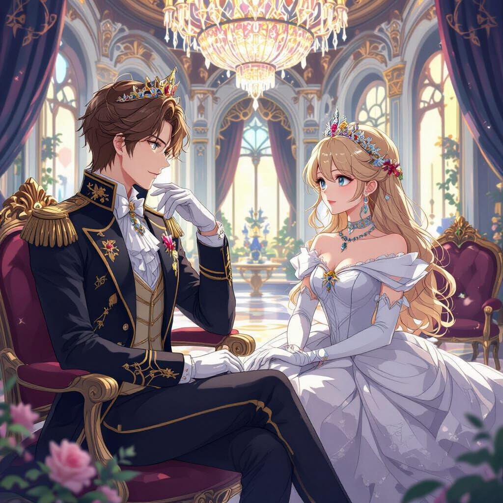 This image shows a regal prince listening to a princess in a ballroom. The illustration is reminiscent of anime key visuals, with delicate lines, vibrant colors, and fairytale-inspired art nouveau patterns.