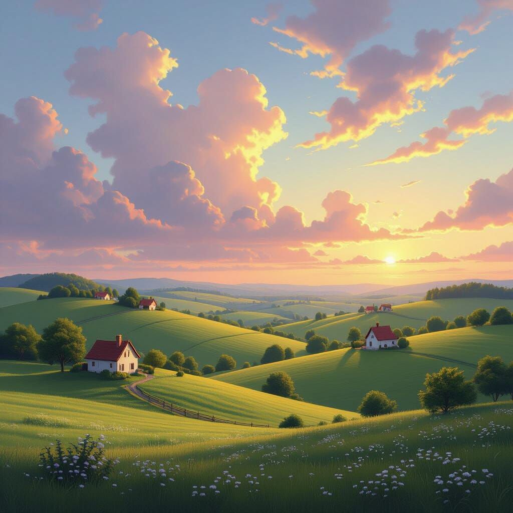 This AI-generated image depicts serene rolling green hills and quaint cottages under a vast, swirling pastel sky. The scene captures the golden light of sunset, rendered in a soft, painterly style.