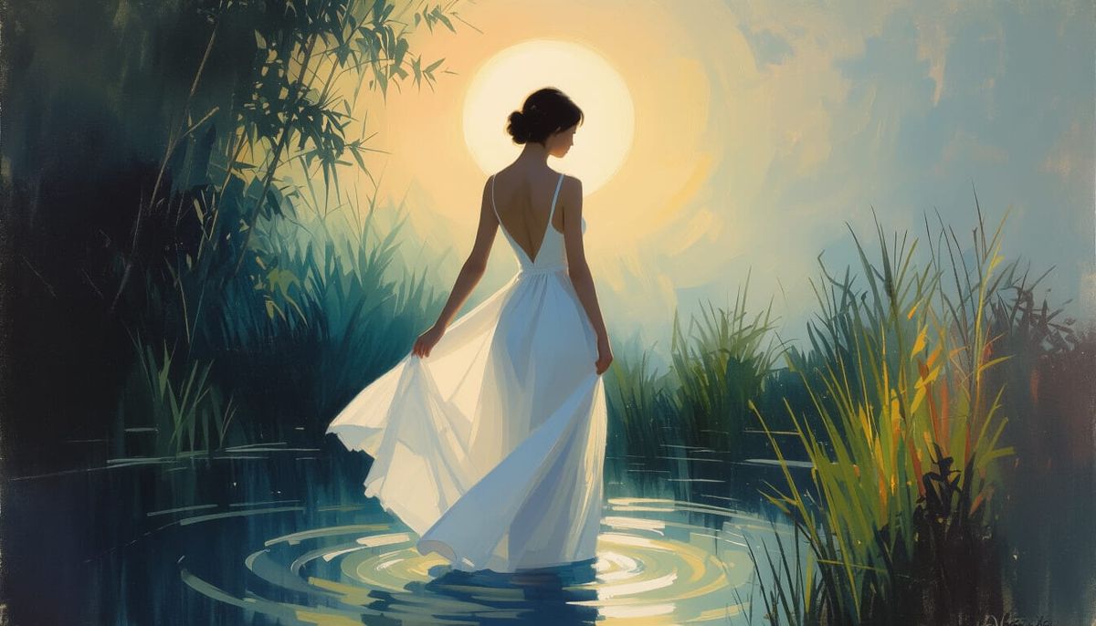This image shows a woman in a white skirt, bathed in soft sunlight and gentle breezes. The artwork evokes modern painting, watercolor, and surrealism, reminiscent of impressionist works.