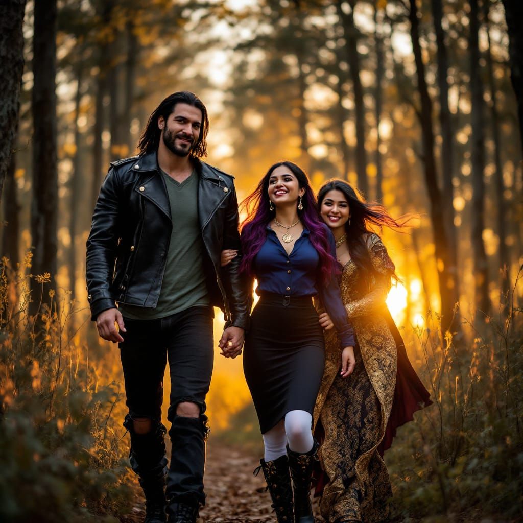 This image shows three friends, two women and a man, smiling at the camera as they walk through a forest during sunset. The scene captures a moment of joy and camaraderie.