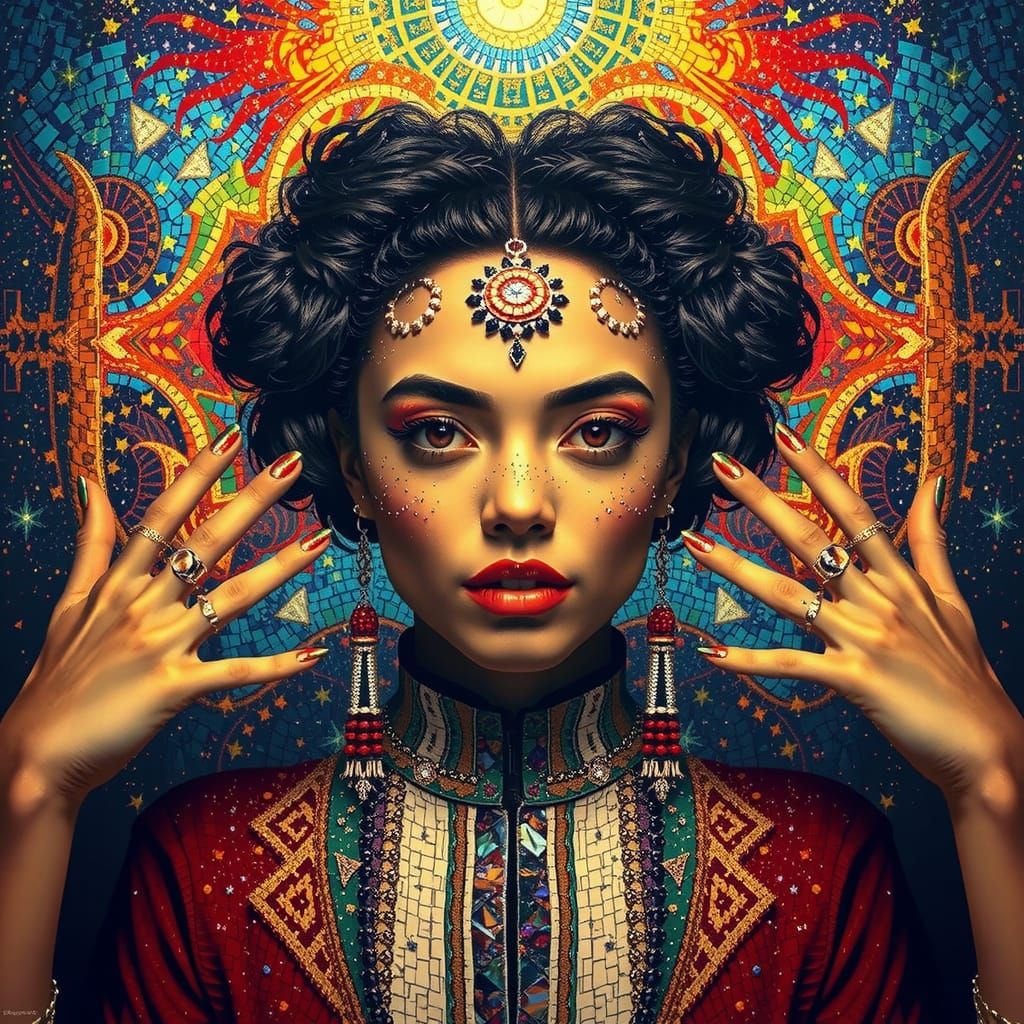 This image shows a photorealistic woman depicted in a vibrant mosaic style. The artwork features iridescent colors and intricate details against a backdrop of a starry night sky in a maximalist style.