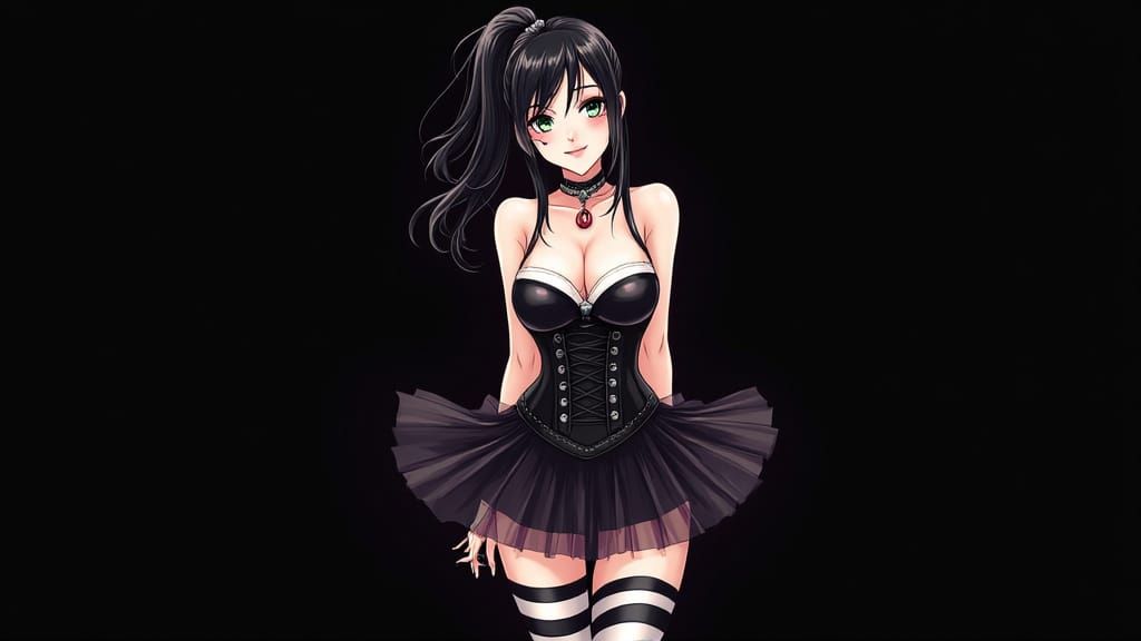 A digital anime-style portrait of a young woman with vibrant green eyes and dark hair in a ponytail. She is smiling softly, wearing gothic makeup and attire against a stark black backdrop. The artwork blends manga aesthetics with vibrant digital art details.