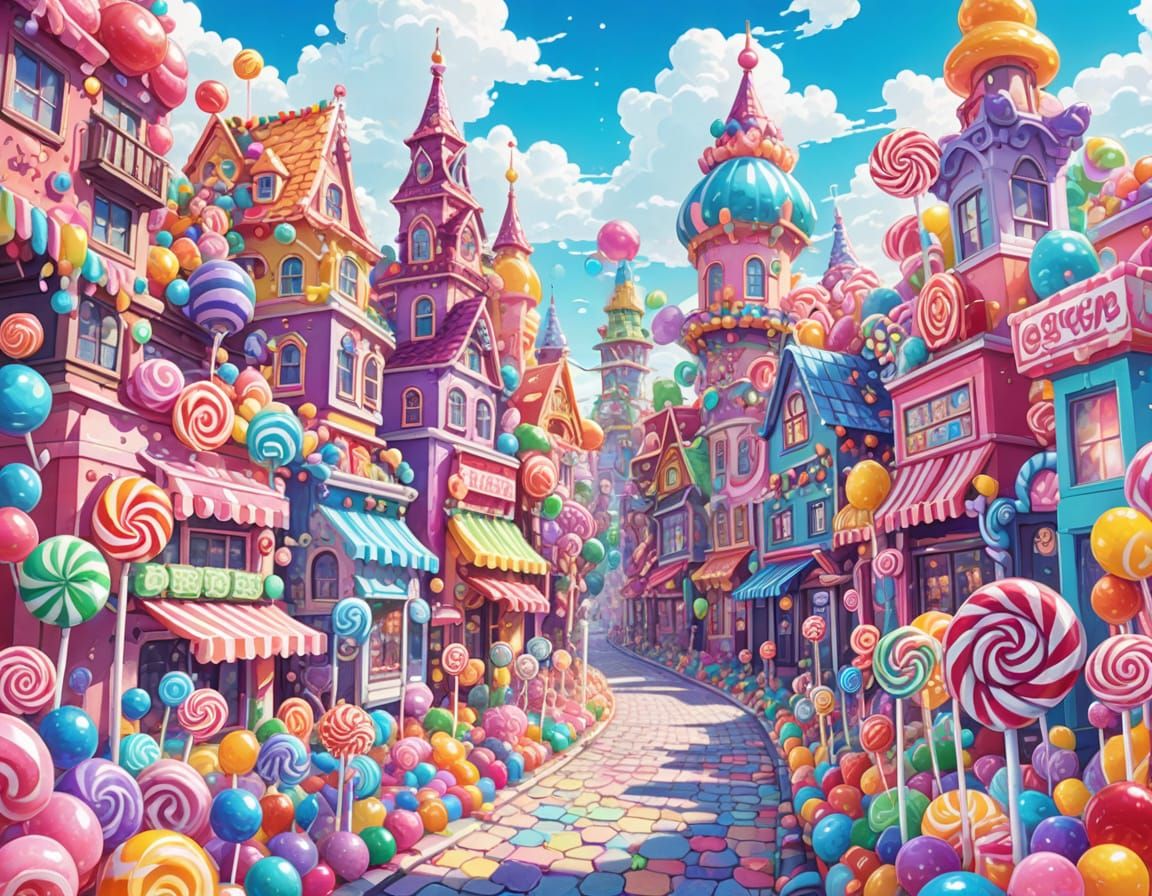 A vibrant digital illustration of a candy city. The close-up shot features sparkling lollipops and colorful gummy bears in a playful, whimsical postmodern style with rainbow colors.