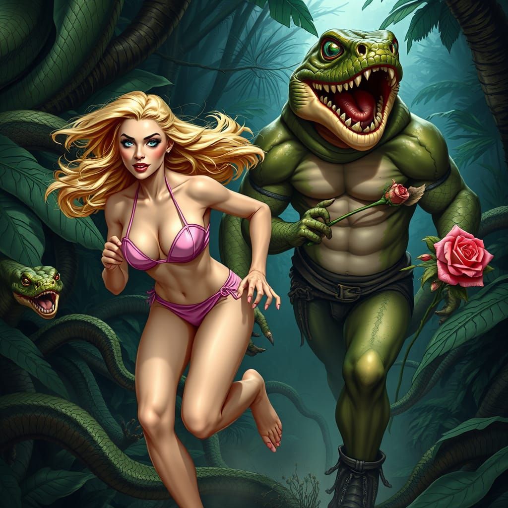 This image shows a stunning blonde woman in a pink bikini, running through the Amazon forest, surrounded by pythons, with a muscular companion in a full-body amphibian costume, in a dynamic, action-packed scene reminiscent of classic fantasy art.