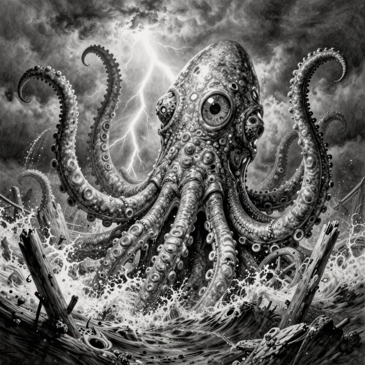 This highly detailed graphite pencil drawing depicts a colossal kraken emerging from the ocean. The immense cephalopod's textured mantle and massive arms, gripping ship debris, are rendered with dramatic upward perspective.