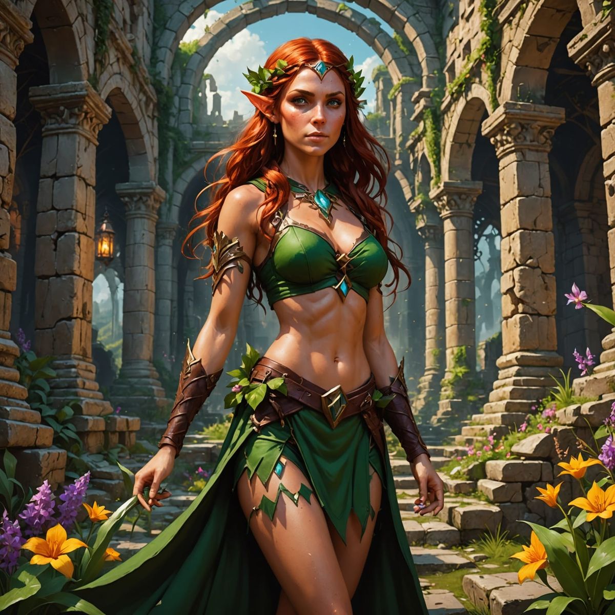 A striking picture of a red-haired elven sorceress casting spells. This fantasy concept art features vibrant colors and intricate details, reminiscent of dark fantasy art.