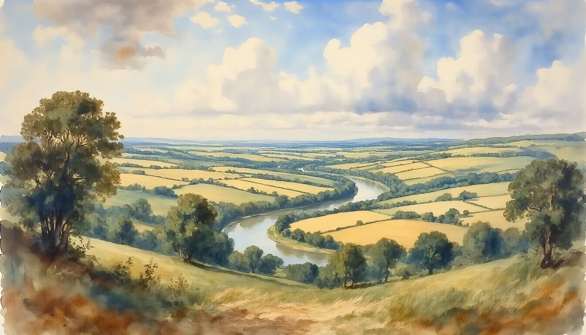 A serene, watercolor-style image of cultivated land viewed from a high vantage point. The landscape features stands of trees and a river winding through fields under a sunny, cloudy sky.
