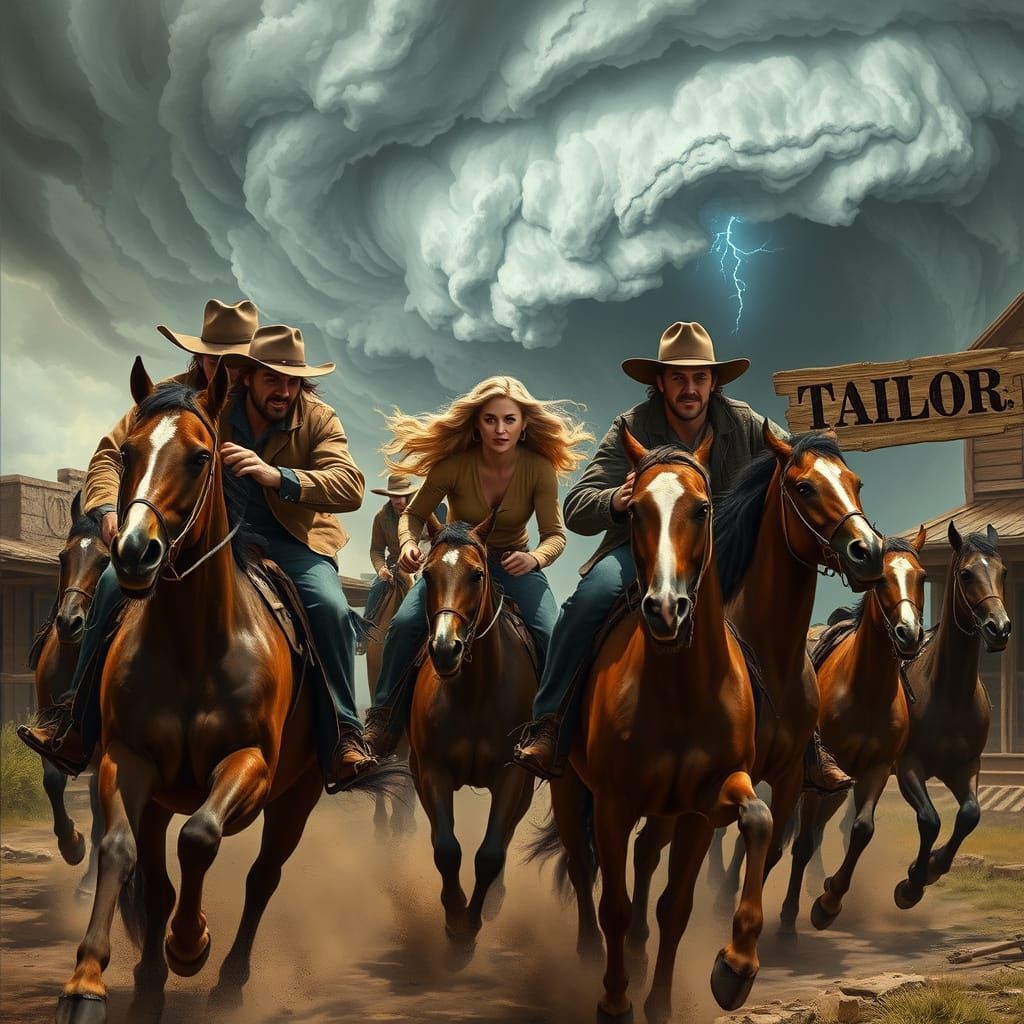 This image depicts a rugged group of cowboys, clad in worn leather and denim, riding horses at a breakneck pace through a dusty 18th century western town, as a lone blonde woman rides alongside, with a dramatic hurricane brewing in the background, rendered in breathtaking hyper-realistic detail.