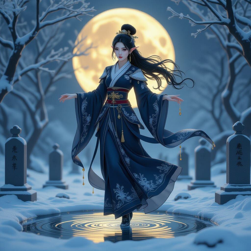 A striking picture of a pale elf in mid-flight, sculpted from liquid gold. She wears traditional Hanfu clothing with mourning embroidery and has dark navy hair. Set against a moonlit, frost-covered landscape in an abstract, sculptural style.