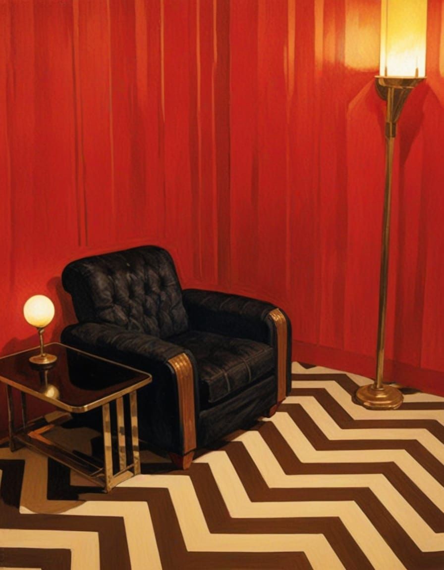 A vintage illustration of The Black Lodge from Twin Peaks. The artwork evokes classic illustration styles with a focus on dramatic lighting and stylized character design.