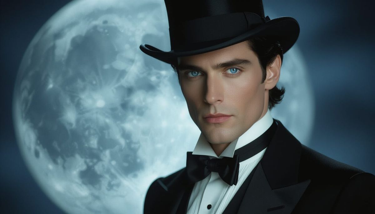 This image shows a man with dark hair and pale skin in a black tuxedo, standing in moonlight surrounded by shadows. The scene evokes cinematic realism with dramatic lighting.