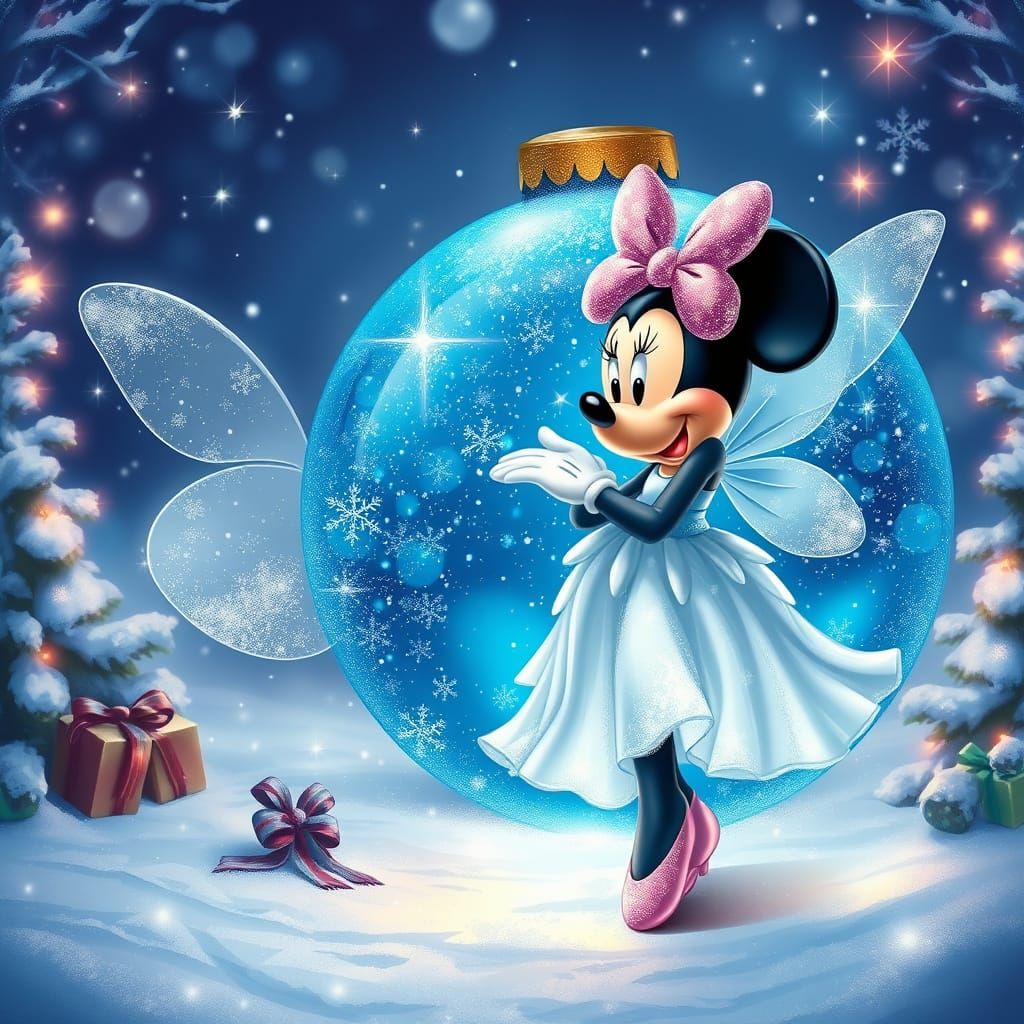 A fantastical and surreal airbrush, oil painting, and alcohol ink artwork depicting a beautiful Christmas fairy Minnie Mouse. The iconic character has translucent wings adorned with glitter, a flowing white dress detailed with blue accents, and ballet slippers. She stands gracefully in the snow next ...