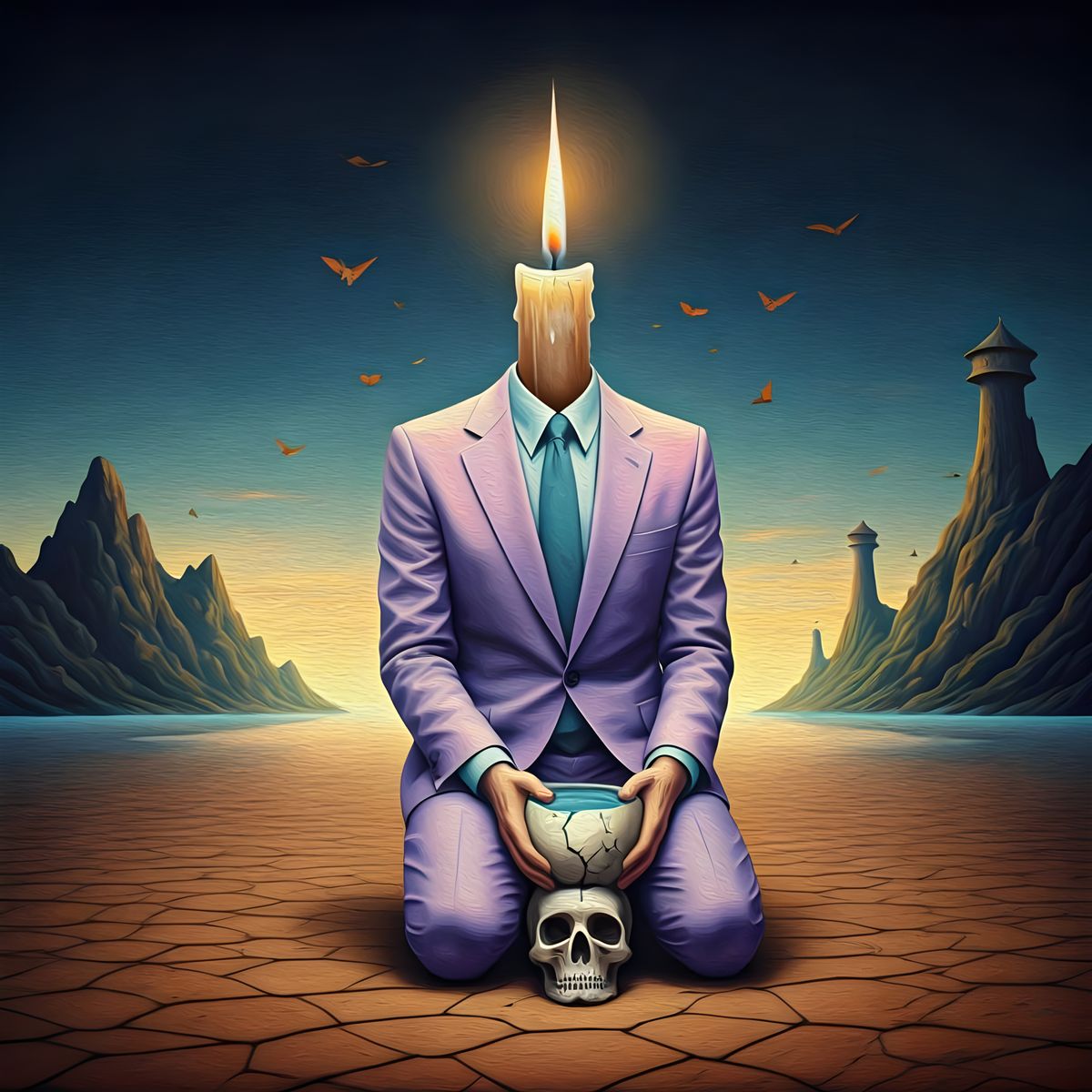 A surreal oil painting in pastel colors depicts a man kneeling on a barren coastline. The figure, in an airbrushed suit, has a candle flame for a head and holds a cracked skull.
