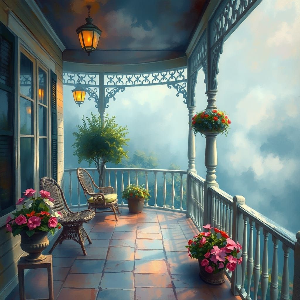 This image showcases a whimsical veranda scene in a hyperrealistic, conceptual art style, blending Impressionist and Maximalist elements with intricate details and vibrant, polychromatic colors.