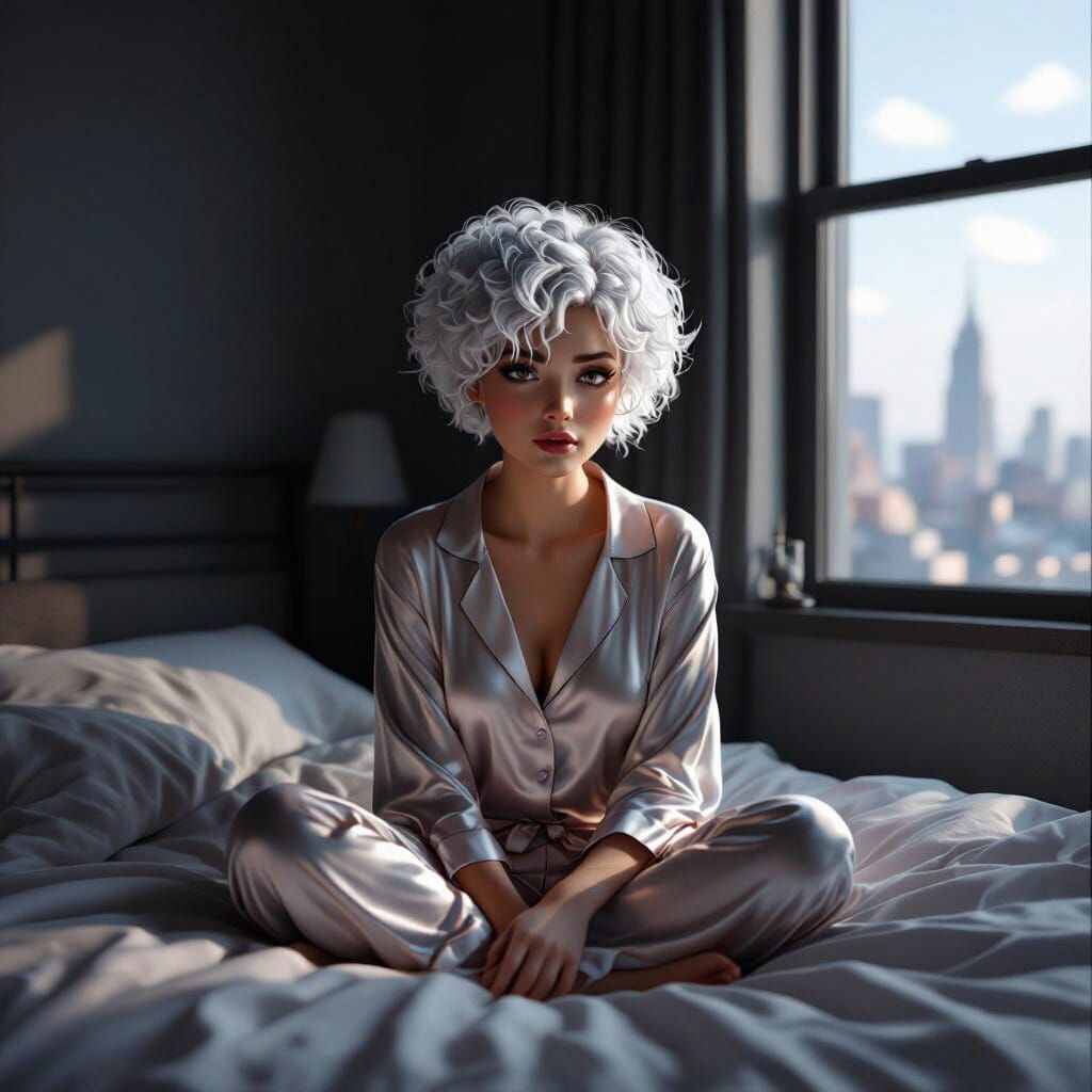 This image shows a woman with white pixie hair in a silk PJ, looking sad in a stark room with a city view. Features dramatic 3D shading and volumetric lighting.