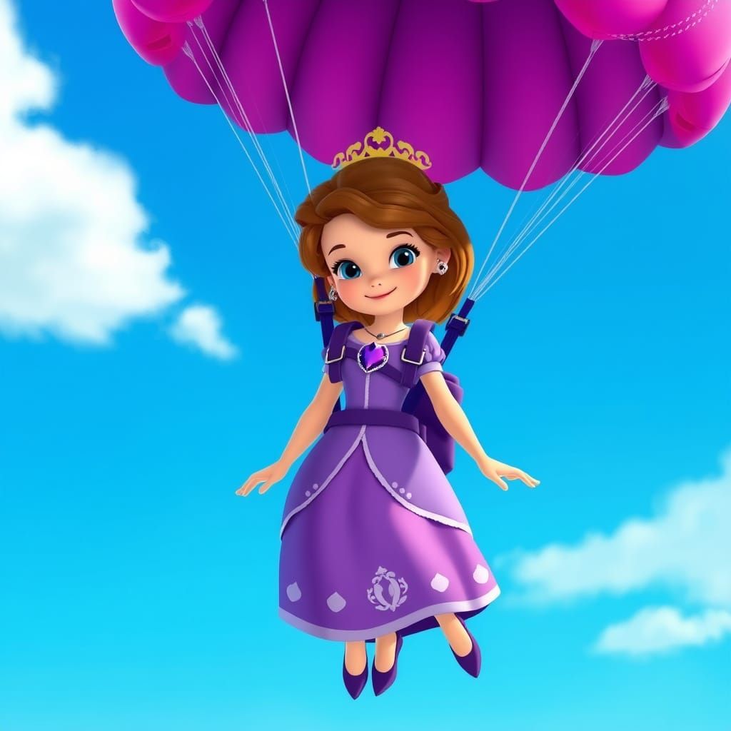 A vibrant image of Princess Sofia floating in the sky with a purple parachute. The princess wears an elegant dress and amulet, rendered in a whimsical Disney animation style.