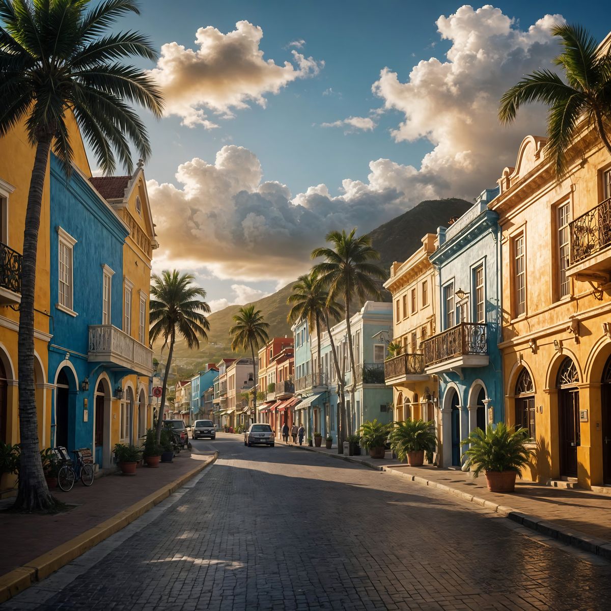 A breathtaking digital artwork of the historical centre of Philipsburg, Sint Maarten, in hot summer. A seamless fusion of modern Sint Maarten.