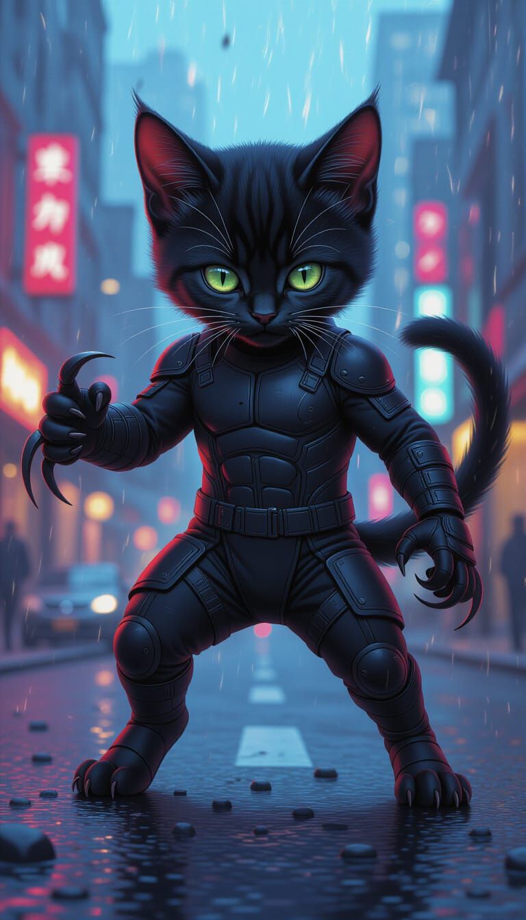 A striking picture of a muscular black kitten with intense eyes and sharp claws. The pose and lighting evoke a futuristic, dark realism with vibrant textures.