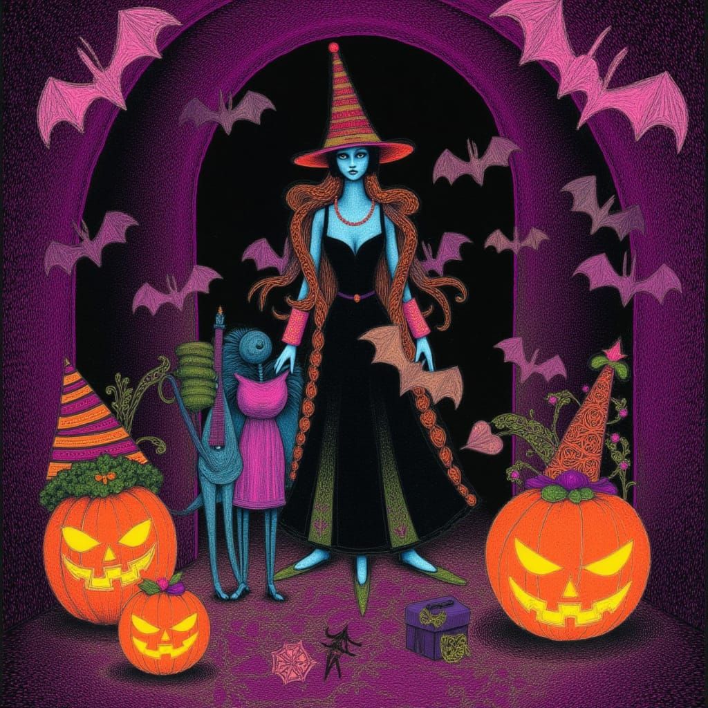 This vibrant illustration depicts a woman with cats in a gothic crypt decorated for Christmas, featuring whimsical bats, glowing pumpkins, and a touch of the bizarre, rendered with intricate mixed media textures and dramatic lighting.